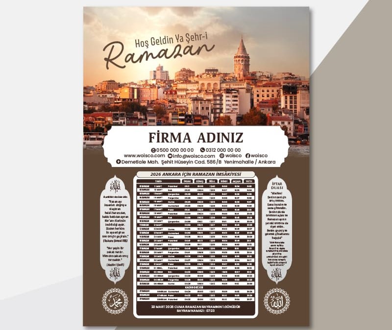 Kişiye özel 2026 yılı Ramazan imsakiye baskısı ile müşterilerinizin evinde ve iş yerinde her gün hatırlanan bir marka olun. Kurumsal logonuz, mesajınız ve ilçe bazlı güncel imsak vakitleri tek üründe buluşur.